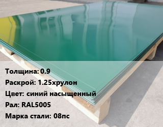 Лист с полимерным покрытием 0.9 1.25хрулон синий насыщенный RAL5005 Сталь: 08пс, тонна, Полиэстер цена от 131 246 Р / м2, где купить, условия доставки в Гродно и Гродненской области