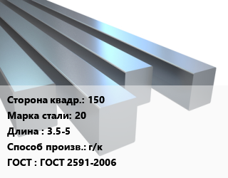 Квадрат стальной 150 Сталь: 20 L=3.5-5 г/к ГОСТ 2591-2006, н/д, под заказ от 5 тн цена от 117 000 Р / т, где купить, условия доставки в Гродно и Гродненской области