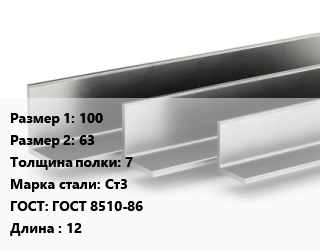 Уголок горячекатаный 100х63х7 Сталь: Ст3 ГОСТ: ГОСТ 8510-86 L=12