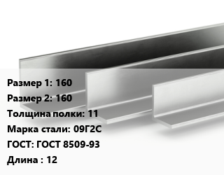 Уголок горячекатаный 160х160х11 Сталь: 09Г2С ГОСТ: ГОСТ 8509-93 L=12, м/д цена от 118 260 Р / т, где купить, условия доставки в Гродно и Гродненской области