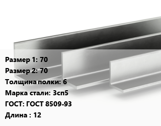 Уголок горячекатаный 70х70х6 Сталь: 3сп5 ГОСТ: ГОСТ 8509-93 L=12, м/д, по запросу,ММК цена от 74 940 Р / т, где купить, условия доставки в Гродно и Гродненской области