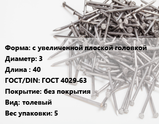 Гвоздь с увеличенной плоской головкой 3х40 ГОСТ: ГОСТ 4029-63 без покрытия толевый 5, ЧП, кг цена от 139.26 Р / кг, где купить, условия доставки в Гродно и Гродненской области