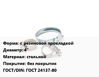 Хомут с резиновой прокладкой D=4" стальной без покрытия ГОСТ: ГОСТ 24137-80, шт цена от 49.97 Р / шт, где купить, условия доставки в Гродно и Гродненской области