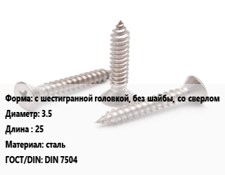 Саморез с шестигранной головкой, без шайбы, со сверлом D=3.5 L=25 сталь ГОСТ: DIN 7504, упаковка 20 кг цена от 2 106 Р / кг, где купить, условия доставки в Гродно и Гродненской области