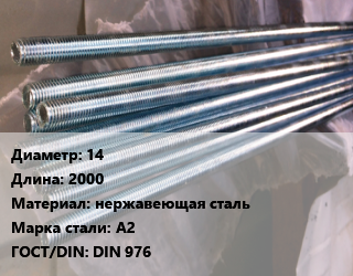 Шпилька стальная 14 L=2000 нержавеющая сталь Сталь: А2 ГОСТ: DIN 976, шпилька, шт цена от 1 612 Р / шт, где купить, условия доставки в Гродно и Гродненской области