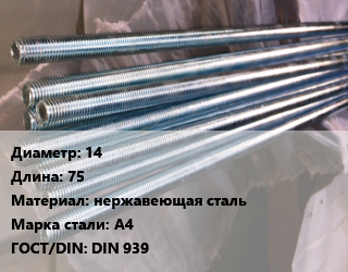 Шпилька стальная 14 L=75 нержавеющая сталь Сталь: А4 ГОСТ: DIN 939, шпилька, шт цена от 337.37 Р / шт, где купить, условия доставки в Гродно и Гродненской области