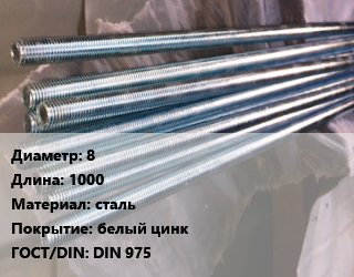 Шпилька стальная 8 L=1000 сталь белый цинк ГОСТ: DIN 975, шпилька, метр цена от 85.5 Р / шт, где купить, условия доставки в Гродно и Гродненской области