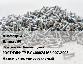 Шуруп 4.5х50 белый цинк ГОСТ: ТУ BY 400024166.007-2008 универсальный, кг цена от 178.31 Р / кг, где купить, условия доставки в Гродно и Гродненской области