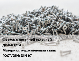 Шуруп с потайной головкой 4 нержавеющая сталь ГОСТ: DIN 97, упаковка 300 шт цена от 153.82 Р / кг, где купить, условия доставки в Гродно и Гродненской области