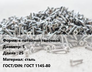 Шуруп с потайной головкой 5х25 сталь ГОСТ: ГОСТ 1145-80, упаковка цена от 5 357 Р / кг, где купить, условия доставки в Гродно и Гродненской области