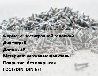 Шуруп с шестигранной головкой 3х20 нержавеющая сталь без покрытия ГОСТ: DIN 571, упаковка 100 шт цена от 7.92 Р / кг, где купить, условия доставки в Гродно и Гродненской области