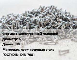 Шуруп с шестигранной головкой 6.3х38 нержавеющая сталь ГОСТ: DIN 7981, упаковка 25 шт цена от 140.4 Р / кг, где купить, условия доставки в Гродно и Гродненской области