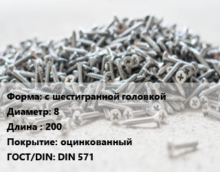 Шуруп с шестигранной головкой 8х200 оцинкованный ГОСТ: DIN 571, упаковка 1000 шт цена от 11 339 Р / кг, где купить, условия доставки в Гродно и Гродненской области