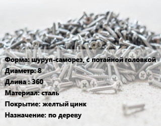 Шуруп шуруп-саморез, с потайной головкой 8х360 сталь желтый цинк по дереву, упаковка цена от 11 098 Р / кг, где купить, условия доставки в Гродно и Гродненской области