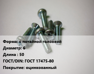 Винт с потайной головкой 6х50 ГОСТ 17475-80 оцинкованный, упаковка 1000 шт,упаковка 5 кг, кг цена от 325.82 Р / кг, где купить, условия доставки в Гродно и Гродненской области