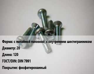 Винт с потайной головкой, с внутренним шестигранником 20х120 DIN 7991 фосфатированный, 10.9, цена за шт, кг цена от 637.2 Р / кг, где купить, условия доставки в Гродно и Гродненской области