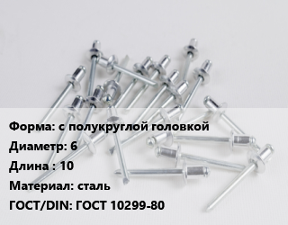 Заклепка с полукруглой головкой 6х10 сталь ГОСТ: ГОСТ 10299-80