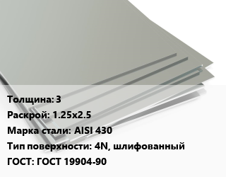 Лист нержавеющий 3 1.25х2.5 Сталь: AISI 430 Тип:4N, шлифованный ГОСТ 19904-90, в пленке цена от 70 550 Р / т, где купить, условия доставки в Гродно и Гродненской области