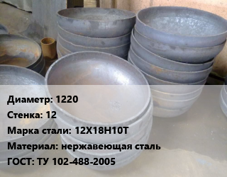 Днище 1220 s=12 Сталь: 12Х18Н10Т нержавеющая сталь ГОСТ: ТУ 102-488-2005, шт, по запросу цена от 58 648 Р / шт, где купить, условия доставки в Гродно и Гродненской области